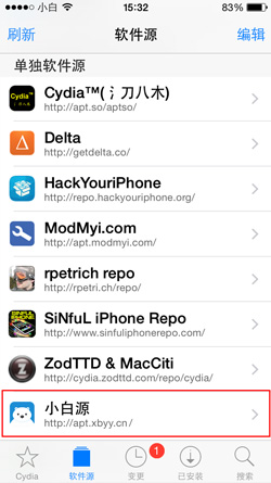 10. 打開(kāi)Cydia(越獄后首次打開(kāi)會(huì)先完成越獄的最后工作),在下面的菜單欄選擇“軟件源”
