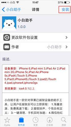 18. 小白助手現(xiàn)已完美兼容至iOS8.4,在越獄成功后,小白助手會(huì)一直陪伴著你,應(yīng)用應(yīng)有盡有,下載永無(wú)盡頭!