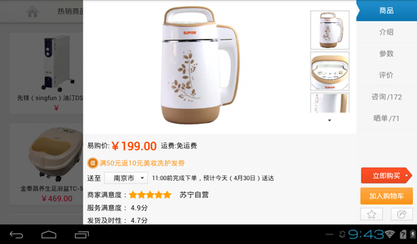蘇寧易購HD(Android Pad)客戶端是安卓平臺(tái)高清客戶端,適用于各尺寸安卓平板,為您提供基于蘇寧易購的搜索、瀏覽、購買、支付等一站式購物體驗(yàn),以及促銷活動(dòng)、虛擬商品、收藏夾、訂單中心、物流追蹤等特色服務(wù)。特色:品類豐富:800000+種商品,全國聯(lián)保,100%正品保障搜索省心:多種搜索方式,供您快速找到心儀商品支付便捷:支持貨到付款、易付寶、快捷支付配送給力:500+城市免費(fèi)配送,1800+門店自提,100+城市半日送達(dá)服務(wù)到家:實(shí)時(shí)更新訂單狀態(tài),展示物流動(dòng)態(tài),隨時(shí)隨處追蹤商品,更有充值繳費(fèi)便民服務(wù)【更新日志】