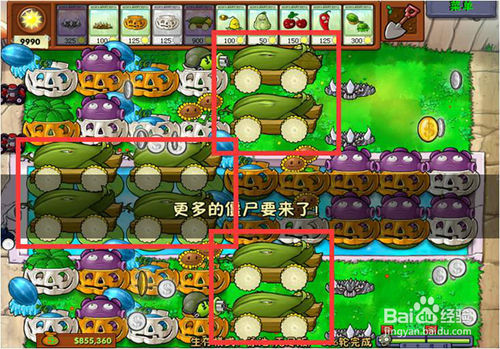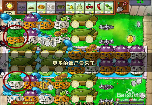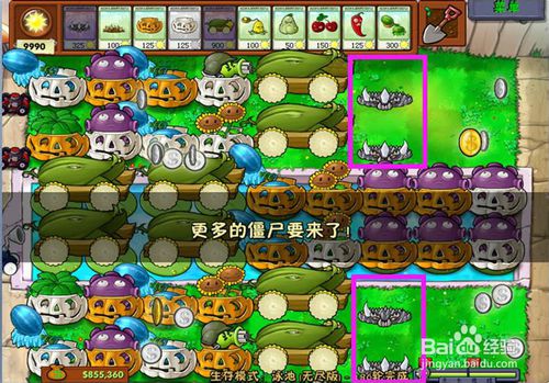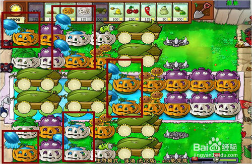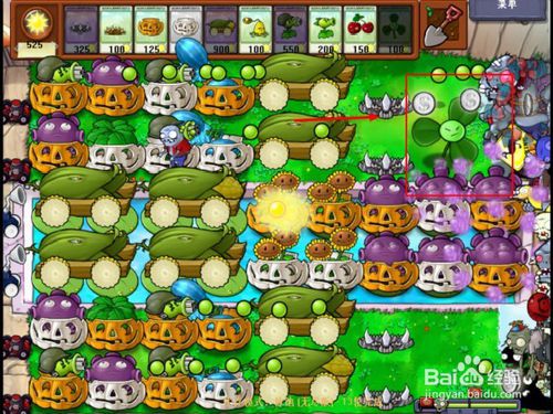 9、在每次每個階段僵尸出來時,必須要選擇的武器有6個,2個地刺,2個南瓜罩,玉米加大炮。千萬要注意,其余的武器根據(jù)出來僵尸的類型選擇。