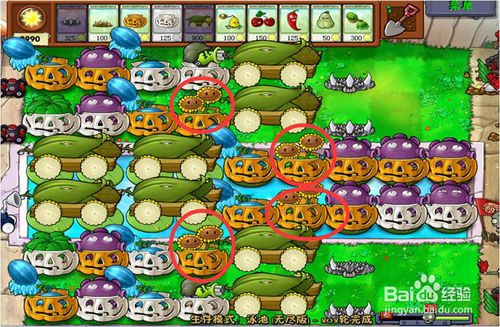 1、第一輪(草坪上),前兩排全部種太陽花(包括水面),防守就用雙發(fā)豌豆射手種在第三排,西瓜投手種在第四排,土豆雷,倭瓜用來預(yù)防萬一,還有玉米射手種在第五第六排(后期用來種玉米加農(nóng)炮)。