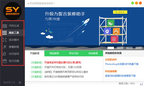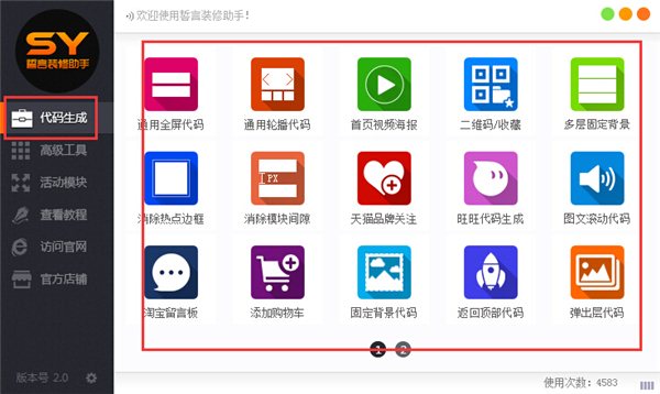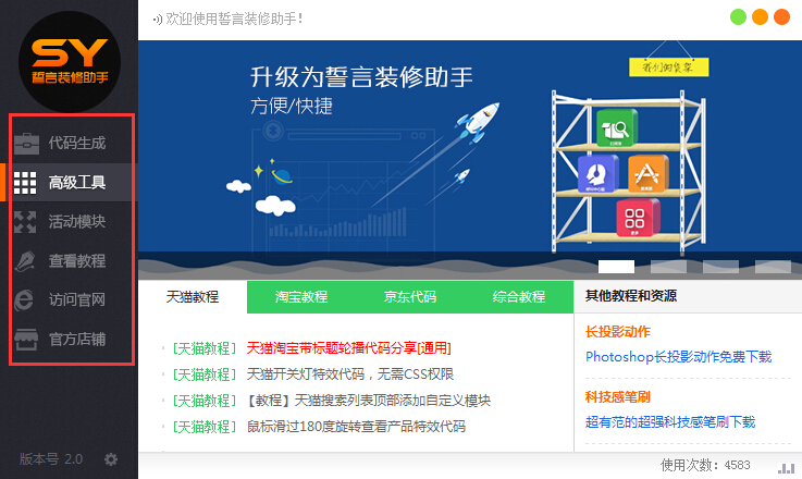 誓言裝修助手是一款專為淘寶店主制作的淘寶裝修設計輔助軟件,這款軟件可以幫助用戶一鍵裝修淘寶店鋪,擁有代碼快速生成功能,支持快速生成通用全屏代碼、通用輪播代碼、首頁視頻海報、多層固定背景、淘寶留言板、固定背景代碼、返回頂部代碼等常用淘寶店鋪裝修代碼,并集成了修復圖片地址、切片批量加鏈接、代碼預覽器、一鍵下載主圖等高級工具,還提供了雙11、雙12的活動模塊,為淘寶店家店鋪裝修提供便利。