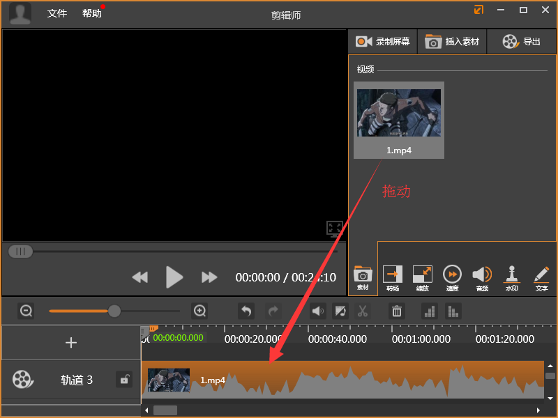 3、添加完畢后拖動該視頻到素材區(qū),如下圖所示: