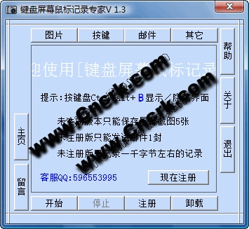 在界面的最上面有四個(gè)單選按鈕-----(圖片\按鍵\郵件\其它),分別用于設(shè)置是否要求定時(shí)保存圖片、是否保存按鍵記錄、是否定時(shí)發(fā)送郵件到您指定的郵箱、及是否要求開(kāi)機(jī)自動(dòng)運(yùn)行等,試用版提供所有功能供測(cè)試。分別在界面的圖片與按鍵中有兩個(gè)長(zhǎng)條形的文本框及上面有省略號(hào)“...”的按鈕,單擊此兩按鈕可以在此設(shè)置圖片及按鍵內(nèi)容所保存的文件夾。默認(rèn)會(huì)保存在當(dāng)前軟件目錄data文件夾中。