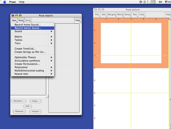 Praat程序由外圍與核心兩層構(gòu)成。外圍主要包括對(duì)象窗口(Object window,標(biāo)題為Praat objects)、畫(huà)板窗口(Picture window,標(biāo)題為Praat picture)、腳本編輯器(ScriptEditor)、按鈕編輯器(ButtonEditor)、數(shù)據(jù)編輯器(DataEditor,無(wú)固定標(biāo)題)、情報(bào)窗口(Info window)和手冊(cè)(Manual)等不負(fù)責(zé)具體的信號(hào)處理任務(wù)的輔助性組件。Praat每次啟動(dòng)時(shí),自動(dòng)打開(kāi)對(duì)象窗口和畫(huà)板窗口。對(duì)象窗口也是Praat的主控窗口,在Praat程序的會(huì)話進(jìn)程中始終打開(kāi),大部分功能也需要由此展開(kāi)。腳本(script)在是Praat中執(zhí)行各種操作的宏命令,能夠簡(jiǎn)化日常操作,減少出錯(cuò),并實(shí)現(xiàn)大量復(fù)雜操作的自動(dòng)化。按照作者的最初設(shè)想,除了Praat之外還會(huì)有其他程序使用與Praat相同的外圍程序,但多年來(lái)一直沒(méi)有實(shí)現(xiàn)。