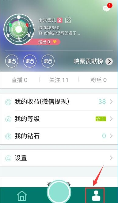 4、點(diǎn)擊最下方右邊的按鈕,即進(jìn)入到個(gè)人中心界面,在這里你可以查看你直播的信息,還有收益等等信息喲。
