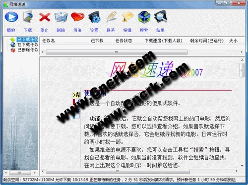 這是一個(gè)自動(dòng)幫你找電影的傻瓜式軟件。安裝以后,它就會(huì)自動(dòng)幫您找網(wǎng)上的熱門電影,然后詢問(wèn)您是否需要下載。您可以選擇查看介紹,如果喜歡就選擇下載,不喜歡的話就選擇否,它會(huì)繼續(xù)尋找新的電影。日常運(yùn)行時(shí)約兩小時(shí)找一部。