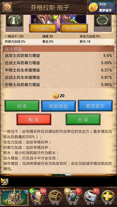 英雄分為兩種,一種是可以帶兵打仗的將領,另一種是可以提升城市發(fā)展的行政官。將領可以升級,并且有不同的品質,品質越好,增加的戰(zhàn)斗增益越高。傳說(橙色)將領是目前最高品質的。每個將領會有不同兵種的專精,比如說弓箭手專精的將領會提升部隊里弓箭手的攻擊、防御。并且將領可以穿裝備,裝備可以鑲嵌寶石,后期裝備、寶石提供的增益可能比將領本身還高。也可以通過刷新增益來得到自己想要的戰(zhàn)斗增益。將領可以在許愿池許愿獲得,也可以通過攻擊山寨、參與活動積累將領碎片,在月亮井中合成。