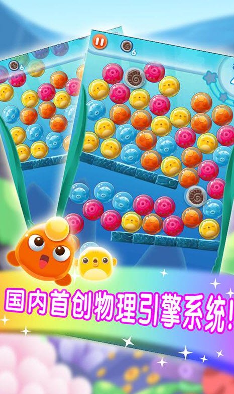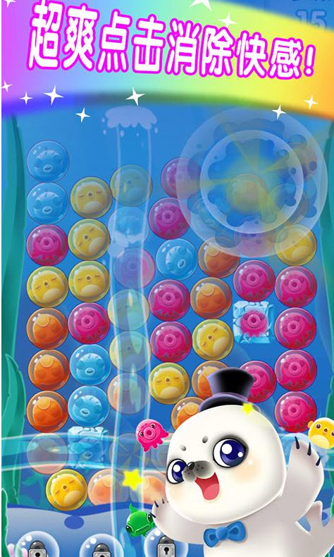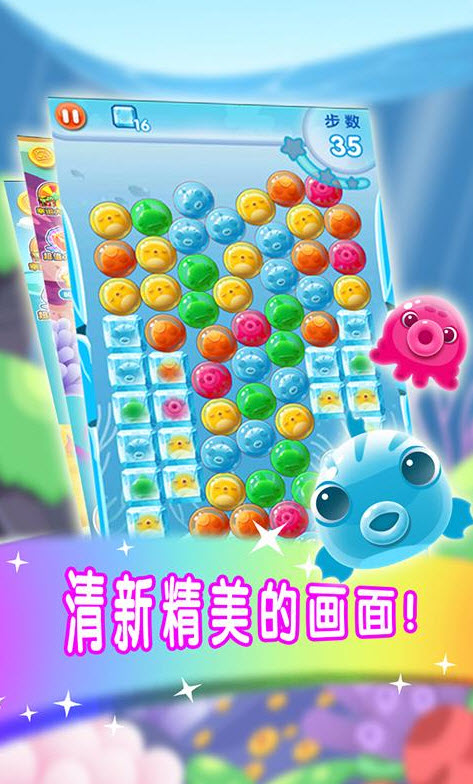 《海底大營救》是一款益智消除類游戲,通過點擊3個或3個以上相鄰的同色泡泡,從而解救困在泡泡里的小魚,或者收集其他目標(biāo)。游戲有80關(guān),限步跟限時關(guān)卡穿插其中,包含近20種玩法。