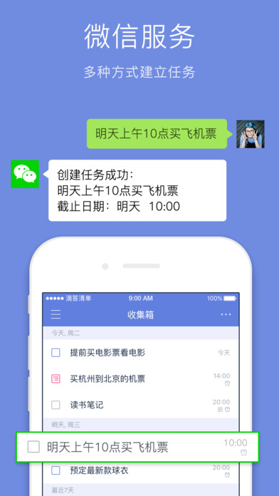 你可以結(jié)合滴答清單的微信服務(wù)號(hào)輔助使用這款A(yù)pp。不同于微信自己的語(yǔ)音提醒服務(wù)號(hào),它的微信號(hào)不僅支持文字和語(yǔ)音識(shí)別創(chuàng)建任務(wù),還支持發(fā)圖片創(chuàng)建任務(wù)、發(fā)聊天記錄創(chuàng)建任務(wù)。