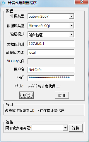 狀態(tài)欄上的第二個圖標(biāo)即代表計費(fèi)代理工具的連接狀態(tài)。在啟用網(wǎng)吧計費(fèi)代理工具時,選擇網(wǎng)吧目前使用的計費(fèi)類型,驗(yàn)證模式建議為“混合模式”,然后輸入數(shù)據(jù)庫的用戶名和密碼,點(diǎn)擊測試驗(yàn)證或者直接點(diǎn)擊應(yīng)用保存設(shè)置。連接成功后,最下方會顯示已連接網(wǎng)吧管家服務(wù)器的地址。