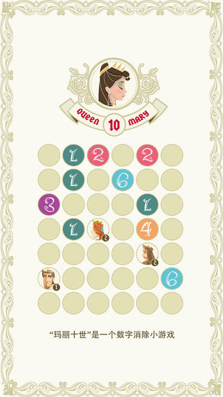 《瑪麗十世(Mary X)》是一款數(shù)字消除游戲。從背景到玩法都散發(fā)著小清新氣息,游戲中玩家要不斷讓瑪麗公主與合適的數(shù)字結(jié)合直到成為瑪麗王后,再讓游離的數(shù)字自身疊加,成為有資格迎娶王后的國王。當(dāng)國王和王后結(jié)合,新一世的瑪麗公主就會出現(xiàn),然后繼續(xù)上一輩的幸福童話。雖然目標不困難,但計算的過程卻十分考驗玩家的大局觀和取舍能力。首先游戲中一共包含1、2、3、4、6這五個數(shù)字,色彩分別為墨綠色、紅色、紫色、橙色和藍色。每次新開局,地圖上都會有個墨綠色的1號小公主,玩家要做的是去尋找一個能讓相同數(shù)字和小公主相結(jié)合的空格:這個空格可以處在小公主所在的十字方向上,也可以是能讓兩者在水平和垂直方向交匯的十字交叉點,找到這樣的點,輕觸一下,公主就獲得成長了。【游戲玩法】