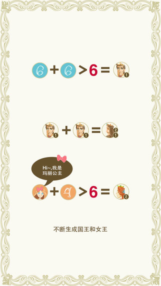 點擊空格融合四個方向的相同數(shù)字超過6就變成國王,公主會變成王后