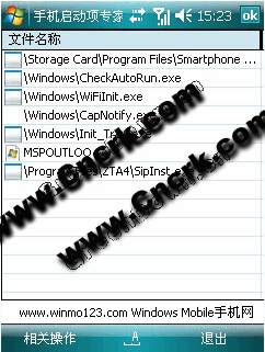 手機(jī)啟動(dòng)項(xiàng)專家可以幫助管理你的WindowsMobile開(kāi)機(jī)自動(dòng)運(yùn)行程序,可以解決部分因?yàn)檐浖_突引起的手機(jī)啟動(dòng)失敗或開(kāi)機(jī)速度緩慢等問(wèn)題,對(duì)于目前的PPC手機(jī)而言它是一款不可多得的系統(tǒng)維護(hù)工具,對(duì)于一些后門(mén)程序、病毒的處理通過(guò)它也很容易檢測(cè)出來(lái)。軟件使用左軟鍵的“”相關(guān)操作“”可以刪除無(wú)用的啟動(dòng)項(xiàng)。