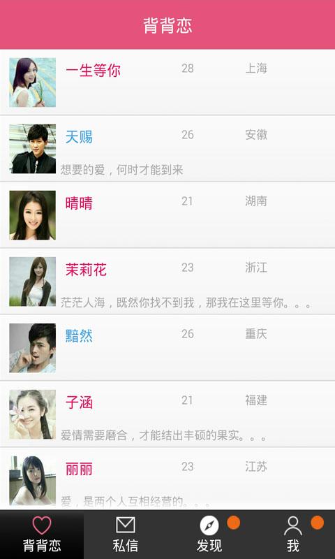 背背戀是一個(gè)面對(duì)大眾化的免費(fèi)婚戀交友平臺(tái),在這里您可以找對(duì)象,征婚,交友,聊天,享受免費(fèi)的服務(wù),背背戀的使命幫助那些單身人士告別單身,有情人終成眷屬,背背戀倡導(dǎo)單身的您們——認(rèn)認(rèn)真真談戀愛(ài),開(kāi)開(kāi)心心見(jiàn)父母。【軟件特點(diǎn)】