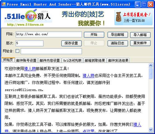 獵人郵箱抓取群發(fā)工具完全免費,并不受任何使用限制。獵人網(wǎng)也采用這個自主開發(fā)的工具,進行網(wǎng)站推廣?;ヂ?lián)網(wǎng)上有很多郵箱抓取工具,我們也嘗試下載使用,雖然功能很多,但都受使用限制,感覺不爽。其實,我們所需要的就是抓郵箱,然后把推廣郵件發(fā)出去;基于這樣的需求,獵人網(wǎng)開發(fā)了郵箱抓取發(fā)送工具,現(xiàn)免費發(fā)布,讓需要的人都能使用。