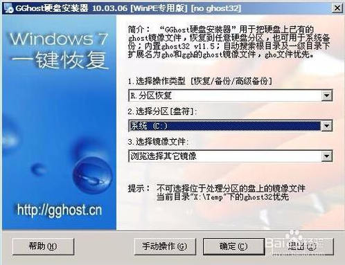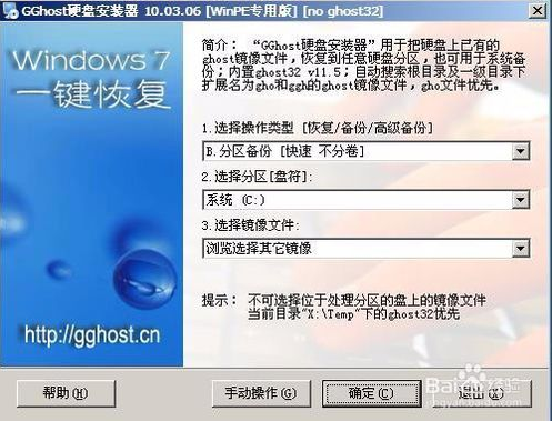 gghost硬盤安裝器winpe專用版首先選擇操作類型(分區(qū)恢復(fù)、備份、高級備份),目標(biāo)分區(qū),然后點擊“確定”按鈕,如圖所示: