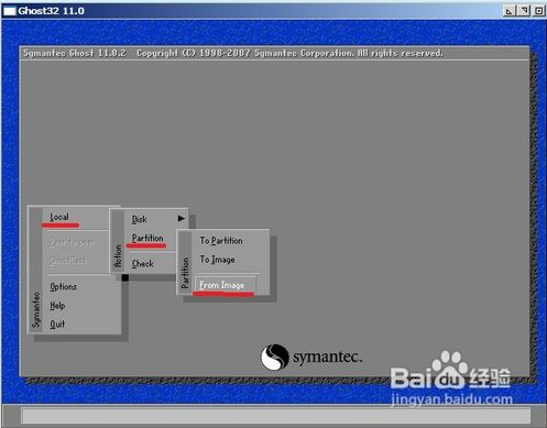 以恢復(fù)光盤鏡像到指定的本地磁盤分區(qū)為例,點擊“l(fā)ocal”,然后選擇“Partition”,最后選擇“From Image”