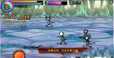當(dāng)同一件武器攻擊次數(shù)過多時,武器會過熱,這時游戲中會自然切換成備用武器。當(dāng)然,玩家在過熱之前想主動切換武器的話,只要按一下屏幕下方的武器按鈕就可以了。屏幕上方的百分比槽表示的是正在冷卻的武器恢復(fù)的數(shù)值?;謴?fù)超過50%的武器就能再次拿出來使用了。