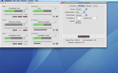 LadioCast for Mac支持Ogg Vorbis和MP3編碼格式。同時配備3英寸/2OUT/2bus音頻混合器,在那里你可以選擇輸入,輸出聲音設備。