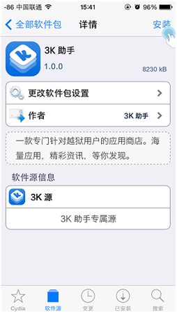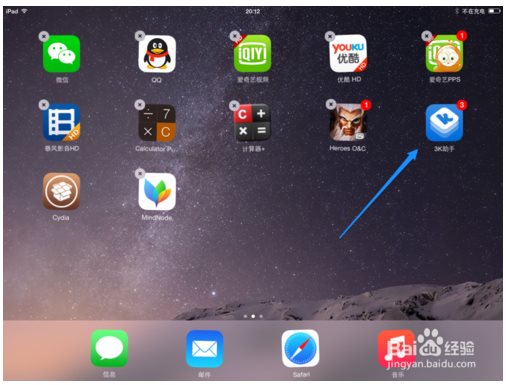 3K助手安裝前需安裝Cydia1、點擊打開桌面上的【Cydia】