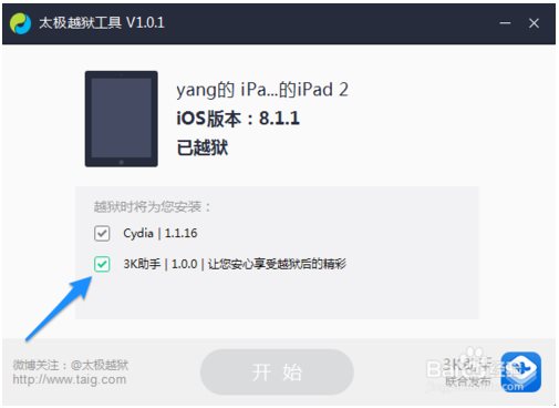 如下圖所示,在為設(shè)備越獄時,會自動集成3K助手。如果沒有取消這個選項的話,在越獄后就會自動安裝它。