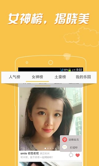 土豪榜:你不是屌絲,你是土豪,是高富帥,那就來上土豪榜吧,在土豪榜上,女孩們能得到禮物的祝福,而你則能進入區(qū)別于眾屌絲的搭訕快速通道,盡顯魅力與實力