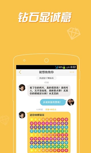 發(fā)美照:生活照、大頭照、素顏照、逼格照、炫富照、亮騷照,秀出最美最帥的自己,采用大圖瀑布流呈現(xiàn),他人可贊、評論、送禮,而且可以私聊打招呼送鉆石:其實妹子也想聊的,但妹子不喜歡豪無誠意的Loser,送顆鉆石給她,想聊就能聊上,別擔心,妹子不回復的話,鉆石會如數(shù)奉還