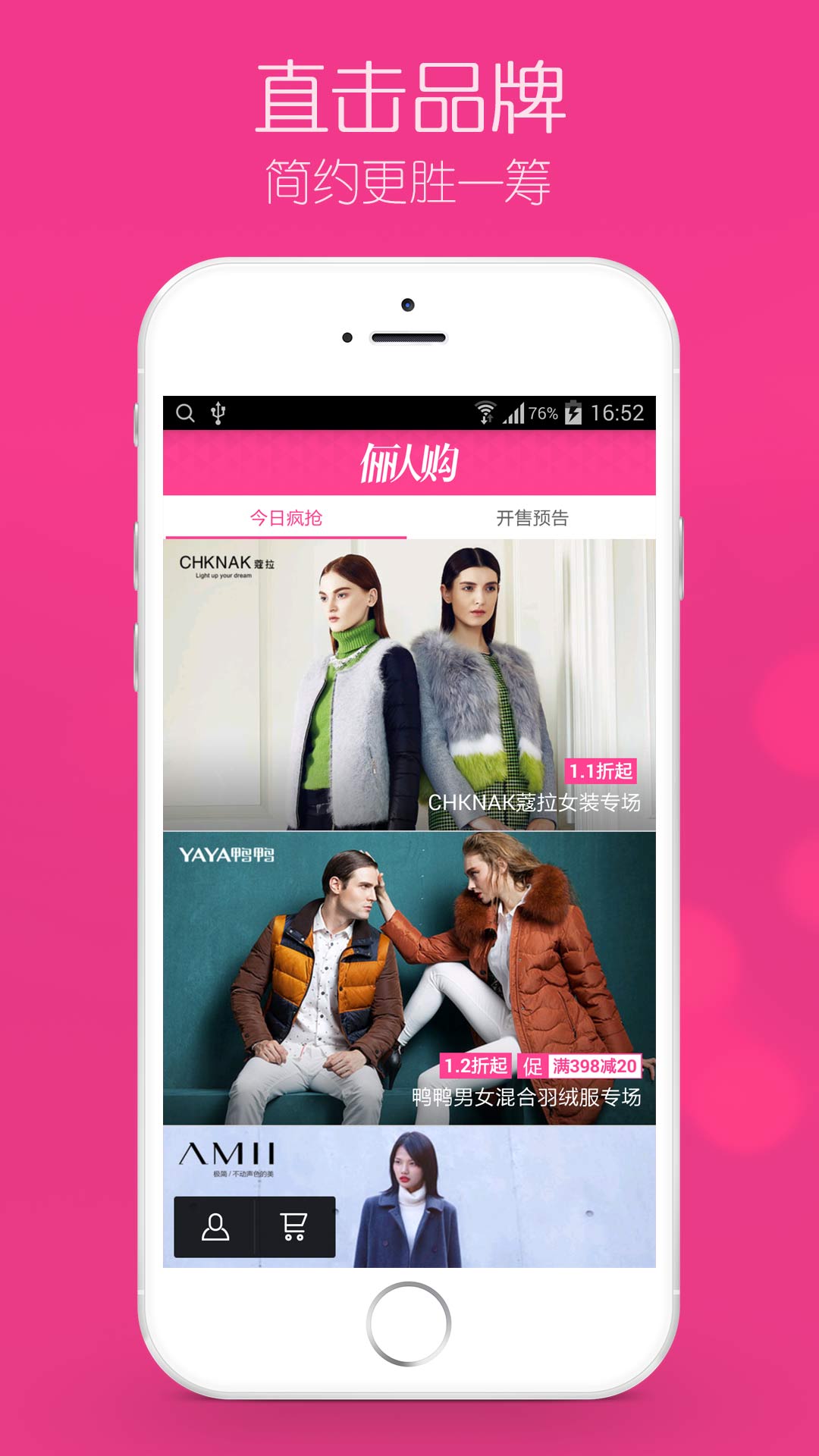 儷人購(gòu),阿里巴巴旗下(淘寶、天貓、聚劃算)品牌特賣網(wǎng)站,目標(biāo)成為用戶口碑和服務(wù)體驗(yàn)最好的品牌特賣網(wǎng)站。品類銷售范圍包括女裝、男裝、鞋包、配飾、童裝、戶外、體用等。儷人購(gòu)所銷售品牌從選品到質(zhì)檢、拍照、包裝、客服,每一個(gè)環(huán)節(jié)都全心投入,力求給用戶更優(yōu)質(zhì)的服務(wù)和體驗(yàn)!【軟件特點(diǎn)】