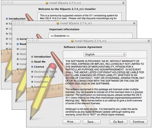 下載完成DMG程序包, 從您系統(tǒng)的下載部分運(yùn)行它:第一個(gè)必需的組件是XQuartz. 這是使用Mac OS Windows X系統(tǒng)的一個(gè)應(yīng)用程序. X Window系統(tǒng)提供標(biāo)準(zhǔn)工具和條款在類似Unix系統(tǒng)支持圖形用戶界面。如果您已經(jīng)安裝或者決定推遲安裝XQuartz, 分別點(diǎn)擊 "Don't install XQuartz for the moment"或者"I've downloaded file by myself".XQuartz 的安裝分為幾個(gè)階段. 首先, 您應(yīng)該閱讀這個(gè)重要信息 (Read Me) 和接受許可條件。