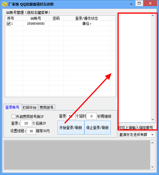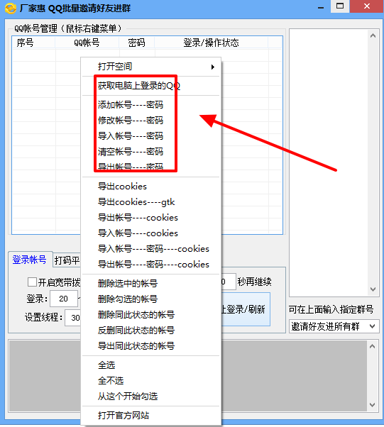 QQ批量邀請好友進群軟件是一款免費軟件功能,批量登錄QQ,批量邀請QQ好友進群,注意:登錄的QQ必須在群中才能邀請哦!而且群開放邀請的情況下!