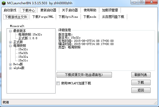 1、運(yùn)行根目錄下的【MCLauncherBN.exe】啟動器后,選擇想要啟動的版本進(jìn)行游戲,1.8.8是最新的正式版,中文版。15w32c是最新的1.9快照版,能夠提前玩到1.9的內(nèi)容。啟動器會自動檢測機(jī)器是否有java并提示下載。點(diǎn)擊【啟動】可以啟動選中的版本。