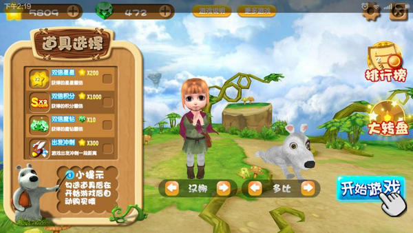打開游戲后,屏幕左方是道具窗口,玩家可以購買道具對本局游戲生效.屏幕中央是角色,玩家可以點(diǎn)擊角色下方的方向鍵切換不同的角色屏幕的右方是寵物。玩家可以點(diǎn)擊寵物下方的方向鍵切換不同的寵物在屏幕的右上角可以調(diào)整系統(tǒng)的音量和音樂的大小。選好角色、寵物和道具就開始游戲吧!點(diǎn)擊左下角的跳躍按鈕可以讓蘇珊跳過小的陷阱。