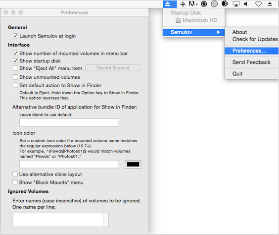 Semulov for Mac完成安裝后會顯示在系統(tǒng)的菜單欄上,以圖標形式通知用戶當前正在運行。它會幫助用戶顯示按類型分類安裝的卷。單擊卷菜單上的選項會卸載/彈出該卷。Semulov for Mac還支持快速卸載和安裝通知。同時它還會顯示磁盤布局網絡卷。