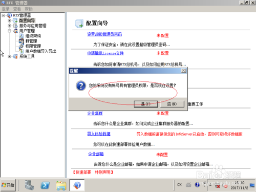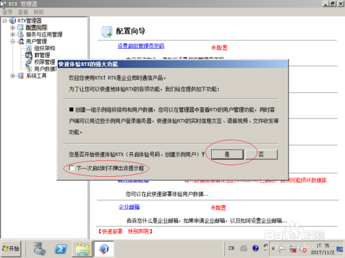 第九步 提示窗口顯示的大意是會自動創(chuàng)建示例組織結構和用戶,幫助你快速體驗RTX的強大功能。如果第一次使用想體驗點擊"是"、如果已熟悉想直接開始部署則點擊"否"。