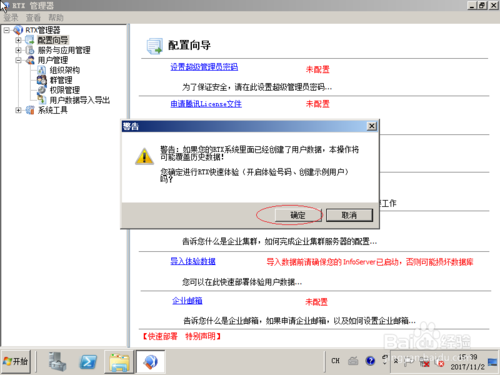 第十步 創(chuàng)建示例組織結構和用戶會覆蓋已有的歷史數(shù)據(jù),謹慎確認。一定要看清楚,再選擇。