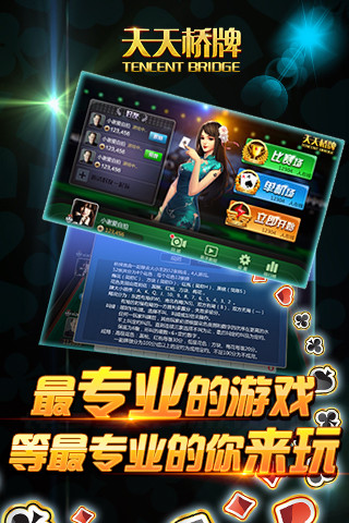 橋牌是一款國際流行的高雅、文明、競技性、技巧性、合作性非常強的體育運動。騰訊出品的天天橋牌致力于打造專業(yè)性強、規(guī)則完善的橋牌游戲。同時支持聯(lián)網(wǎng)對戰(zhàn)和單機練習等多個玩法,也支持邀請微信和手Q好友進行游戲。天天橋牌是騰訊傾力打造的專業(yè)橋牌游戲,包含單機練習、聯(lián)網(wǎng)對戰(zhàn),使用雙重出牌操作模式,配以強大的牌友系統(tǒng),不愁沒搭檔,快來一起打牌吧!