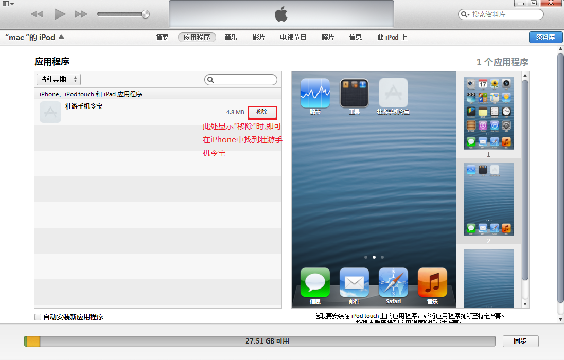 5、此處顯示“移除”時,即可在Iphone中找到壯游手機令寶。