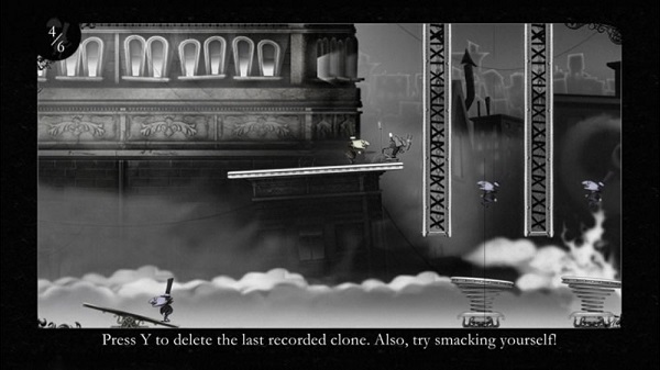 在《溫特伯頓先生的不幸旅程》玩家想要利用蹺蹺板跳到高處,可以先在蹺蹺板的一端按住按鍵后跳躍,錄制自己跳一下的動(dòng)作,放開按鍵后就會(huì)出現(xiàn)一個(gè)分身不斷地在原地跳動(dòng);這個(gè)時(shí)候趕緊到蹺蹺板的另一端,就可以讓跳躍中的分身踩下蹺蹺板,把自己送到高處。當(dāng)然這個(gè)只是最基本的應(yīng)用方式,依照關(guān)卡的設(shè)計(jì),玩家甚至需要一口氣錄制四到五個(gè)分身來輔助自己的行動(dòng)。【使用方法】