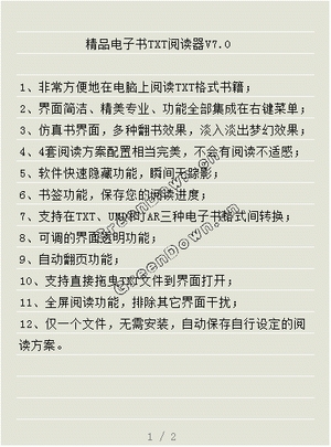 精品電子書TXT閱讀器 1、非常方便地在電腦上閱讀TXT格式書籍; 2、界面簡潔、精美專業(yè)、功能全部集成在右鍵菜單; 3、仿真書界面,多種翻書效果,淡入淡出夢幻效果; 4、4套閱讀方案配置相當(dāng)完美,不會有閱讀不適感; 5、軟件快速隱藏功能,瞬間無蹤影; 6、書簽功能,保存您的閱讀進(jìn)度; 7、支持在TXT、UMD和JAR三種電子書格式間轉(zhuǎn)換; 8、可調(diào)的界面透明功能; 9、自動翻頁功能; 10、支持直接拖曳TXT文件到界面打開; 11、全屏閱讀功能,排除其它界面干擾; 12、僅一個(gè)文件,無需安裝,自動保存自行設(shè)定的閱讀方案。 快捷鍵說明 打開:ctrl+O 轉(zhuǎn)換格式:ctrl+S 上一頁:左箭頭或pageup 下一頁:右箭頭或pagedown 轉(zhuǎn)到:ctrl+T 自動翻頁:ctrl+A 全屏:ctrl+F 書簽:ctrl+B 快速隱藏ctrl+Q 退出:Esc ·本軟件需要系統(tǒng)安裝Microsoft.NETFramework2.0或以上版本 ·
