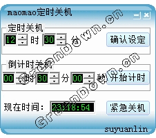 maomao定時(shí)關(guān)機(jī) V2.0 簡(jiǎn)體中文綠色免費(fèi)版 倒計(jì)時(shí)關(guān)機(jī)、定時(shí)關(guān)機(jī)、緊急快速關(guān)機(jī)(10秒之內(nèi))功能,界面友好,無(wú)需安裝,打開即可運(yùn)行。當(dāng)您需緊急關(guān)機(jī),定時(shí)關(guān)機(jī)時(shí),本程序會(huì)是你的好幫手
