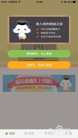 在“校園”主頁面,如果您已有“和教育”賬號,可以點擊“我有賬號,馬上登錄”按鈕,跳轉(zhuǎn)至客戶端登錄界面。沒有賬號,則點擊加入班級進行操作。