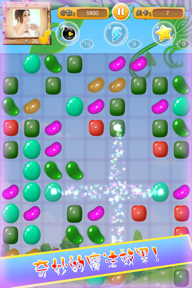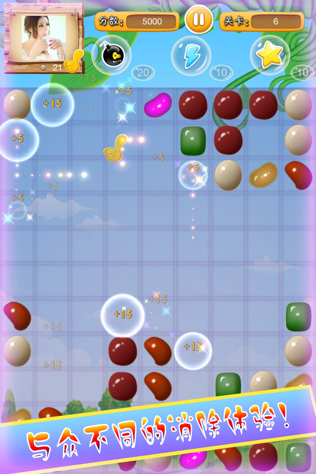 -沒有時間限制,消除每關(guān)所有豆豆即可過關(guān),非常休閑,適合打發(fā)無聊時間挑戰(zhàn)模式-首關(guān)時間60秒,消除的每一顆豆豆加0.5秒,過一關(guān)加10-30秒的時間,直到時間減到0,游戲結(jié)束統(tǒng)計最高分,然后可以打開排行榜查看在美女中排第幾名,有沒有跟美女搭訕的機會;