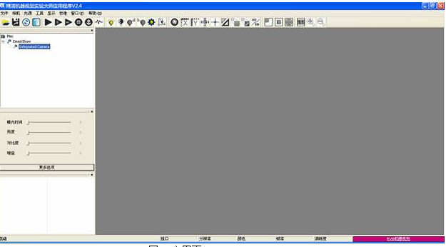 機器視覺實驗大師運行以后,顯示如圖1的界面。主界面由主菜單,工具欄,狀態(tài)欄,相機導(dǎo)航欄,相機屬性欄和相機性能欄,以及視場窗口組成。