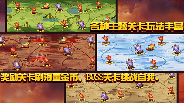 四個(gè)主題的關(guān)卡,分別是木板、雪地、石板、巖漿。四個(gè)關(guān)卡的摩擦力各不相同,各個(gè)主題的地形都有自己獨(dú)特的障礙。每個(gè)主題除了普通關(guān)卡還有獎(jiǎng)勵(lì)和boss關(guān)卡。獎(jiǎng)勵(lì)關(guān)卡可以刷大量的金幣,但是需要惡魔果實(shí)作為交換才能進(jìn)入。