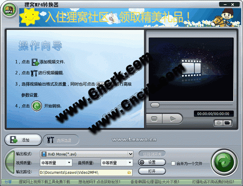 貍窩mp4視頻轉(zhuǎn)換器 v4.1.0.0 簡體中文官方安裝版 貍窩mp4視頻轉(zhuǎn)換器是一款功能強大的rmvb轉(zhuǎn)mp4視頻轉(zhuǎn)換器,它可以將幾乎所有流行的視頻格式,如:RM、RMVB、VOB、DAT、VCD、DVD、SVCD、ASF、MOV、QT、MPEG、WMV、MP4、3GP、DivX、XviD、AVI等視頻文件轉(zhuǎn)換為MP4機、智能手機、AppleiPod所支持的視頻格式。