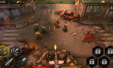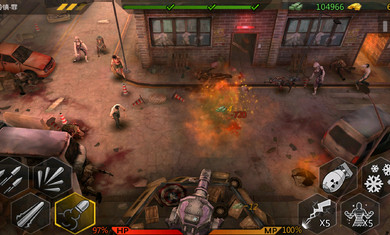 3.搖桿控制人物行走,右下角的虛擬鍵可以對僵尸進(jìn)行射擊;