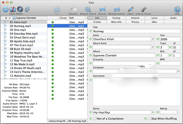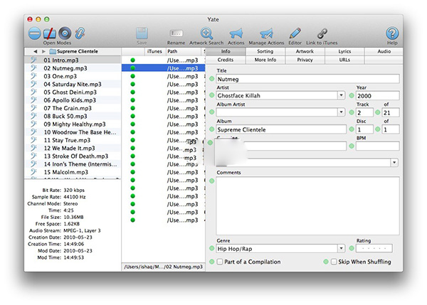 Yate有一長串的特征;最重要的是,創(chuàng)新性的腳本系統(tǒng)調(diào)用操作。操作可用于更新所有專輯標簽與單一操作。雅特還支持與音軌、Discogs、AcoustID、iTunes的集成??梢暂p松地還原所有的更改,可以按任何順序撤消單個更改。不論你想要自動或手動標記您的文件,Yate可以做這一切!