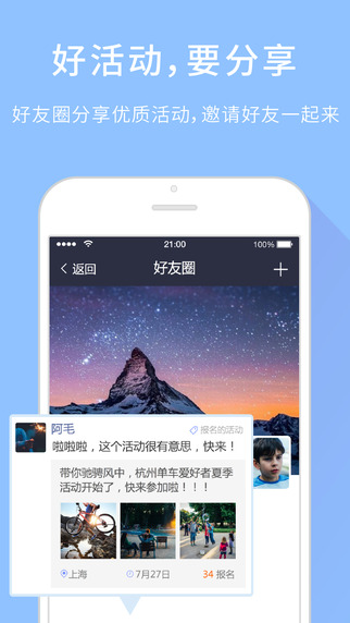 查看好友發(fā)起和參與的活動,共享精彩人生?;顒泳煞窒碇廖⑿?、QQ、微博等各大平臺,呼朋喚友簡單有愛。