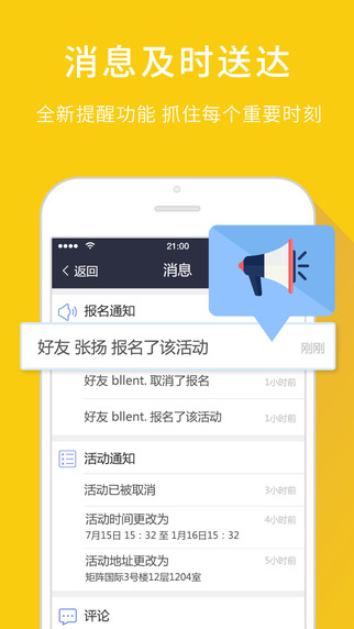 發(fā)布、報名、收藏、邀請等所有活動一目了然,分類管理。消息、動態(tài)即時提醒,最忠誠的活動管理小秘書。
